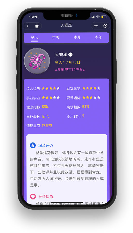 这里可以问事业、婚姻、财运、健康等,讲解全面独到,详细预测分析你的人生运势。星座速配:轻松查询您与恋人的配对指数,为您的爱情道路提供最完美的建议。热门测算:测姻缘、八字算命、周公解梦、每日一签,通晓未来。
